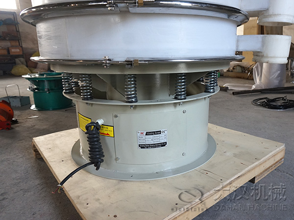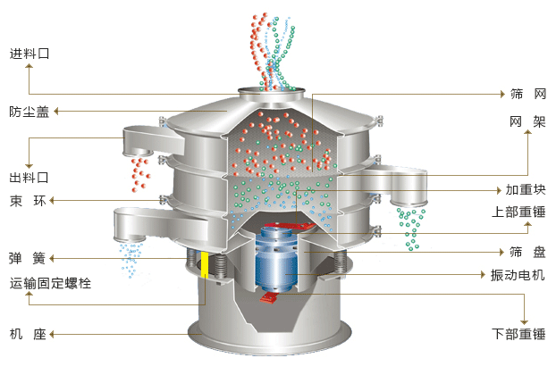 塑料振動(dòng)篩采用YZUL立式振動(dòng)電機(jī)作為激振源,通過(guò)振動(dòng)電機(jī)上下兩端的偏心重錘將旋轉(zhuǎn)運(yùn)動(dòng)轉(zhuǎn)變?yōu)樗健⒋怪?、傾斜的三次元運(yùn)動(dòng),并傳遞到旋振篩的篩面上;物料通過(guò)入料口進(jìn)入設(shè)備內(nèi),根據(jù)不同物料篩分要求,物料經(jīng)過(guò)1-5層采用不同目數(shù)的金屬編織篩網(wǎng)的篩分層,在這個(gè)過(guò)程中,位于各層的篩網(wǎng)下的清網(wǎng)裝置通過(guò)頻率振動(dòng)不斷撞擊不銹鋼篩網(wǎng),使篩網(wǎng)上層物料能夠順暢的透網(wǎng)篩分,并有效解決了物料堵網(wǎng)問(wèn)題出現(xiàn),不同目數(shù)的物料通過(guò)各層對(duì)應(yīng)目數(shù)的篩網(wǎng)后在各層的出料口排出,終實(shí)現(xiàn)篩選除雜或過(guò)濾分級(jí)的目的。