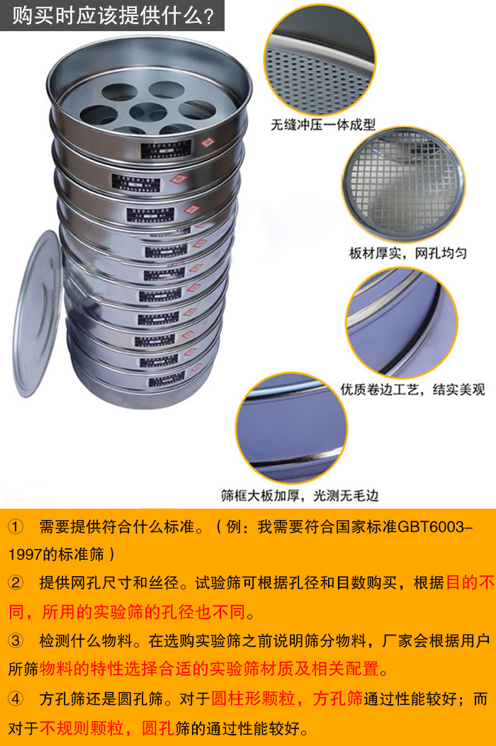 如果您是為實(shí)驗(yàn)室購(gòu)買(mǎi),則必須要求外表精致美觀實(shí)用,網(wǎng)孔,經(jīng)過(guò)專(zhuān)業(yè)檢測(cè)儀器檢驗(yàn)過(guò)的,符合國(guó)家標(biāo)準(zhǔn)GBT6003-1997或國(guó)際標(biāo)準(zhǔn)ISO3310-1:1990的標(biāo)準(zhǔn)篩。