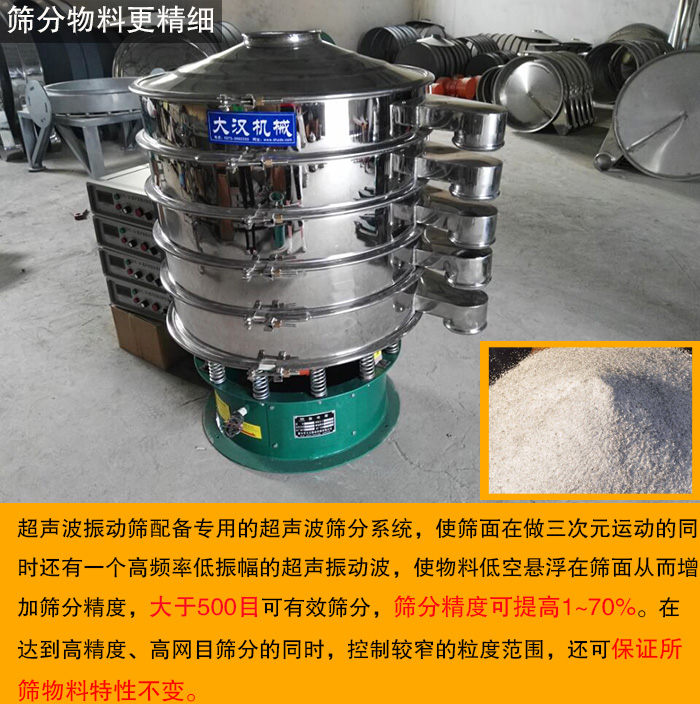 對(duì)于一些細(xì)粉、微粉類物料普通的振動(dòng)篩很難完成的篩分,特別是500目以上的物料,普通的振動(dòng)篩分機(jī)更難達(dá)到, 因?yàn)樵诤Y分中它們?nèi)菀壮霈F(xiàn)結(jié)塊和漏料的情況。超聲波振動(dòng)篩能很好的避免。超聲波振動(dòng)篩配備專用的超聲波篩分系統(tǒng),使篩面在做三次元運(yùn)動(dòng)的同時(shí)還有一個(gè)高頻率低振幅的超聲振動(dòng)波,使物料低空懸浮在篩面從而增加篩分精度,篩分精度可提高1~70%。在達(dá)到高精度、高網(wǎng)目篩分的同時(shí),控制較窄的粒度范圍,還可保證所篩物料特性不變。比普通的旋振篩多了一套超聲波發(fā)生裝置,該裝置安裝在網(wǎng)架的下端,可以通過該裝置對(duì)較為精細(xì)的物料進(jìn)行篩分,物料不僅受到振動(dòng)電機(jī)的振動(dòng),而且還受到超聲波換能器的機(jī)械振動(dòng),因此篩分物料較為精細(xì)。