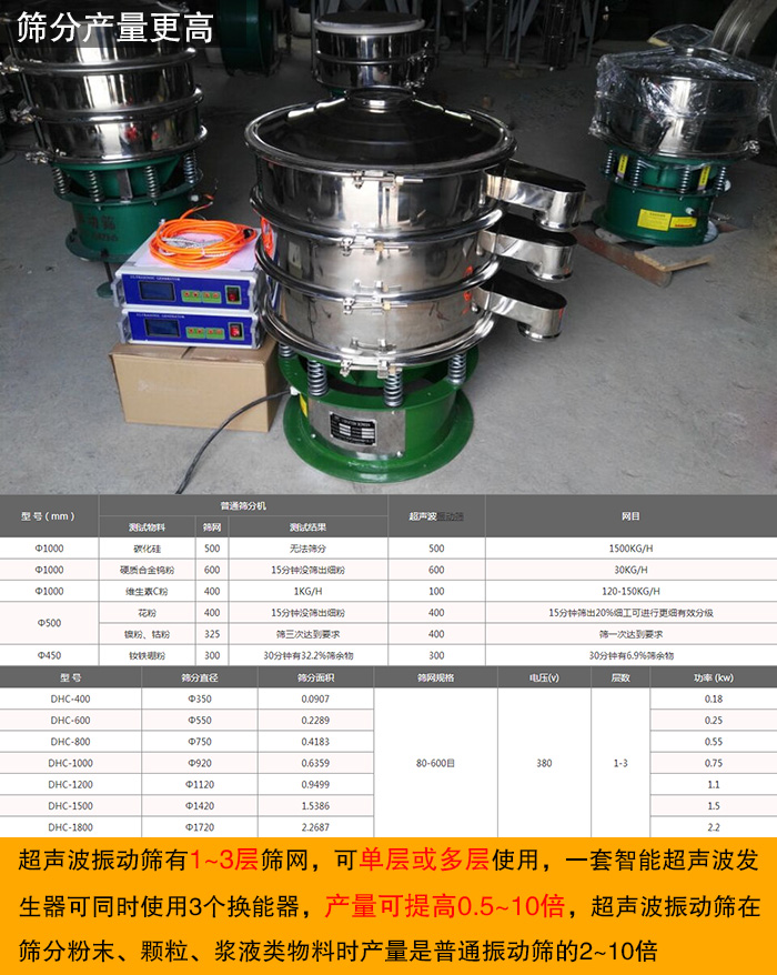 超聲波振動(dòng)篩有1~3層篩網(wǎng),可單層或多層使用,一套智能超聲波發(fā)生器可同時(shí)使用3個(gè)換能器,產(chǎn)量可提高0.5~10倍,超聲波振動(dòng)篩在篩分粉末、顆粒、漿液類物料時(shí)產(chǎn)量是普通振動(dòng)篩的2~10倍。而且為了盡可能滿足各行業(yè)對(duì)精細(xì)篩分的需求,超聲波振動(dòng)篩的型號(hào)種類多樣,不同型號(hào)的超聲波振動(dòng)篩對(duì)應(yīng)著不同的篩分面積,相應(yīng)的篩分效率、處理量也相差很大,可以完全滿足不同行業(yè)的細(xì)粉篩分需求。