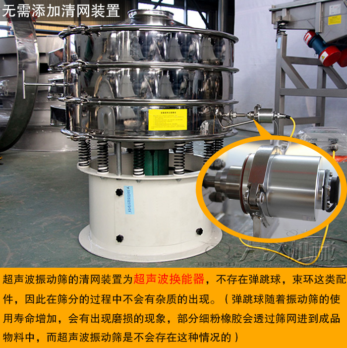 超聲波振動(dòng)篩的清網(wǎng)裝置為超聲波換能器,不存在彈跳球,束環(huán)這類配件,因此在篩分的過程中不會(huì)有雜質(zhì)的出現(xiàn)。(彈跳球隨著振動(dòng)篩的使用壽命增加,會(huì)有出現(xiàn)磨損的現(xiàn)象,部分細(xì)粉橡膠會(huì)透過篩網(wǎng)進(jìn)到成品物料中,而超聲波振動(dòng)篩是不會(huì)存在這種情況的)