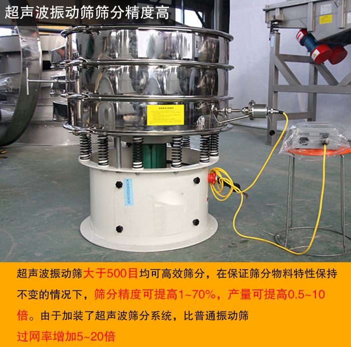 超聲波振動(dòng)篩大于500目均可高效篩分,在保證篩分物料特性保持不變的情況下,篩分精度可提高1~70%,產(chǎn)量可提高0.5~10倍。由于加裝了超聲波篩分系統(tǒng),可有效分解粘附物質(zhì),減少篩上物,比普通振動(dòng)篩過(guò)網(wǎng)率增加5~20倍。
