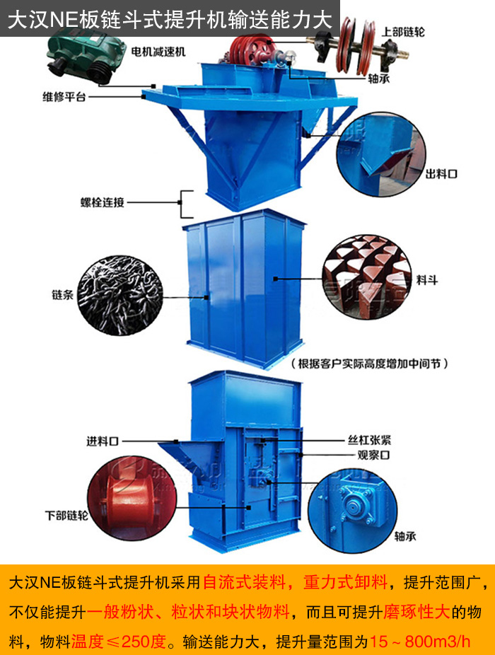 大漢NE板鏈斗式提升機(jī)采用自流式裝料,重力式卸料,提升范圍廣,不僅能提升一般粉狀、粒狀和塊狀物料,而且可提升磨琢性大的物料,物料溫度≤250度。輸送能力大,該系列提升機(jī)具有NE15~NE800多種規(guī)格,提升量范圍為15~800m3/h。