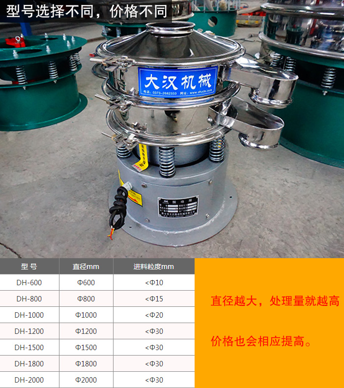 新鄉(xiāng)大漢食品振動篩常見型號有:直徑400mm、600mm、800mm、1000mm、1200mm、1500mm、1800mm等,不同型號的食品振動篩,其篩面直徑也是不一樣的,所以這對食品振動篩的處理量有一定的影響,直徑越大,處理量就越高,價格也會相應提高。