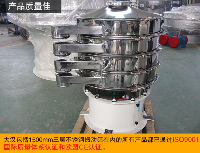 大漢生產(chǎn)出來(lái)的每一臺(tái)不銹鋼振動(dòng)篩均采用先進(jìn)的生產(chǎn)工藝、精湛的焊接工藝制造而成,大漢從選材的精良,到技術(shù)的革新,再到做工的精湛,再到成品的嚴(yán)格檢查,對(duì)每一環(huán)節(jié)都牢牢監(jiān)控,。目前,大漢包括1500mm三層不銹鋼振動(dòng)篩在內(nèi)的所有產(chǎn)品都已通過(guò)ISO9001國(guó)際質(zhì)量體系認(rèn)證和歐盟CE認(rèn)證。
