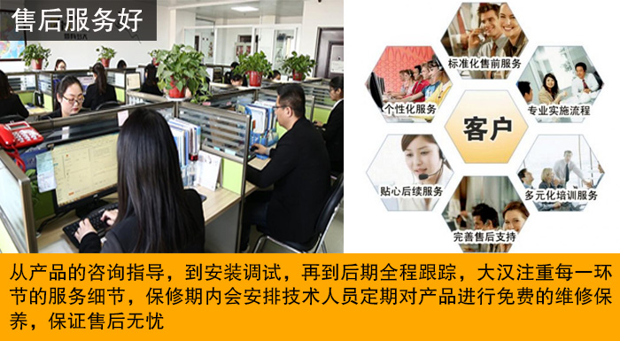 大漢公司采用一站式服務(wù)體系,從產(chǎn)品的咨詢指導(dǎo),到安裝調(diào)試,再到后期全程跟蹤,大漢注重每一環(huán)節(jié)的服務(wù)細(xì)節(jié),致力于為客戶解決一切疑難問(wèn)題,保修期內(nèi)會(huì)安排技術(shù)人員定期對(duì)產(chǎn)品進(jìn)行免費(fèi)的維修保養(yǎng),保證售后無(wú)憂。