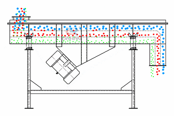 直線振動篩主要由篩箱、篩框、篩網、振動電機、電機臺座、減振彈簧、支架等組成。