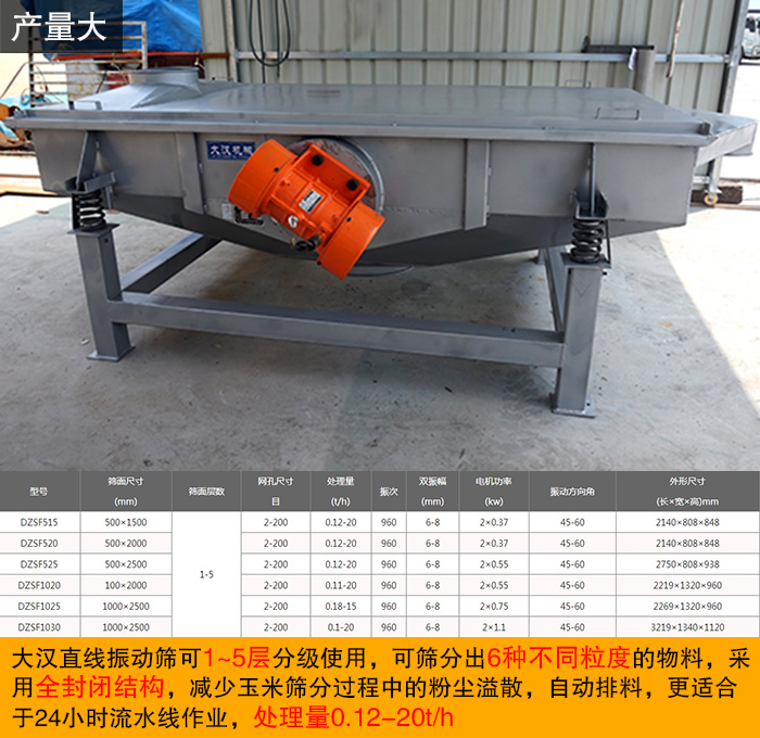 大漢直線振動篩可1~5層分級使用,可篩分出6種不同粒度的物料,采用全封閉結構,減少玉米篩分過程中的粉塵溢散,自動排料,更適合于24小時流水線作業(yè),處理量0.12-20t/h。