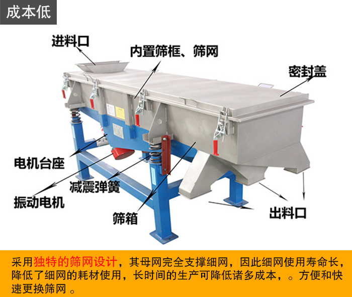直線振動篩作為為常見的一種振動篩,采用獨特的篩網設計,其母網完全支撐細網,因此細網使用壽命長,降低了細網的耗材使用,長時間的生產可降低諸多成本,方便和快速更換篩網 。
