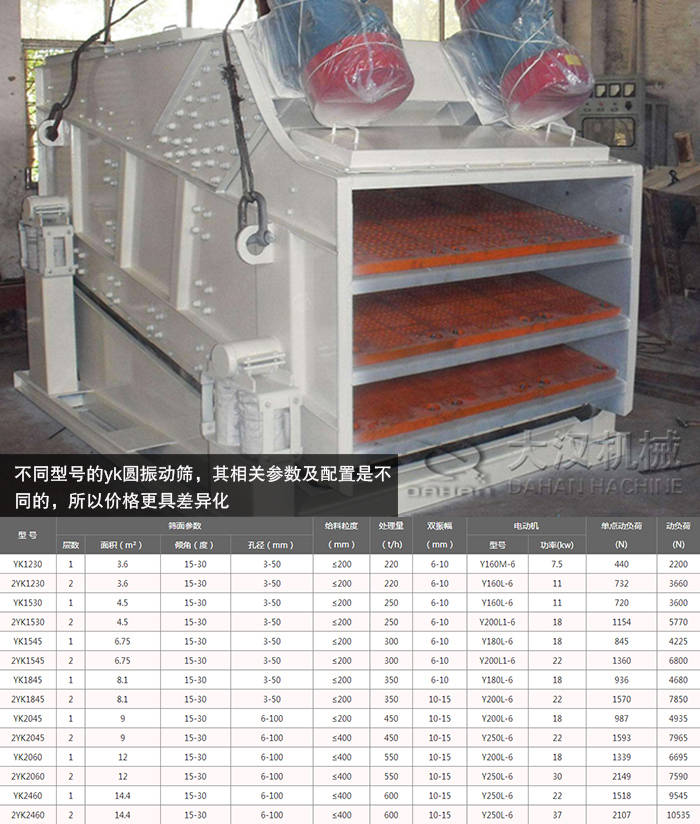 yk圓振動(dòng)篩型號(hào)眾多,不同型號(hào)的yk圓振動(dòng)篩價(jià)格是不同的。大漢yk圓振動(dòng)篩型號(hào)有yk1230、yk1530、yk1545、yk1845、yk2045、yk2060、yk2460等,不同型號(hào)的yk圓振動(dòng)篩,其相關(guān)參數(shù)及配置是不同的,所以價(jià)格更具差異化,另外大漢yk圓振動(dòng)篩多層篩面設(shè)計(jì),價(jià)格也會(huì)相應(yīng)受到影響。