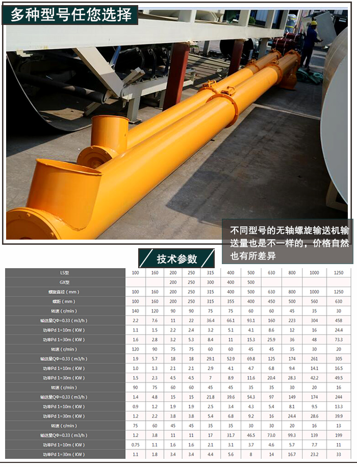 WLS無軸螺旋輸送機型號包括WLS100、WLS160、WLS100、WLS200、WLS250、WLS315、WLS400、WLS500、WLS630、WLS800、WLS1000、WLS1250等,不同型號的無軸螺旋輸送機,其螺旋直徑是不同的,所以導致不同型號的無軸螺旋輸送機輸送量也是不一樣的,價格自然也有所差異。