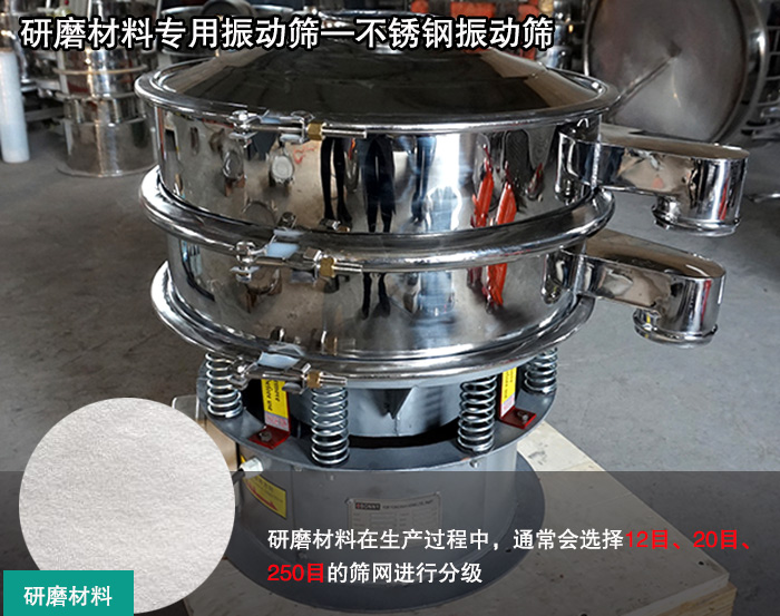 不銹鋼振動篩可篩分至500目或0.028mm粉狀及顆粒狀物料,非常符合研磨材料篩分目數(shù)要求。
