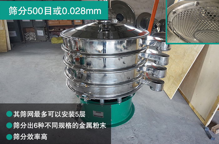 大漢金屬粉末振動篩可以篩分500目或0.028mm粉塵及顆粒狀物料,篩分精準,其篩網(wǎng)可以安裝5層,篩分出6種不同規(guī)格的,功能十分強大,篩分效率高。
