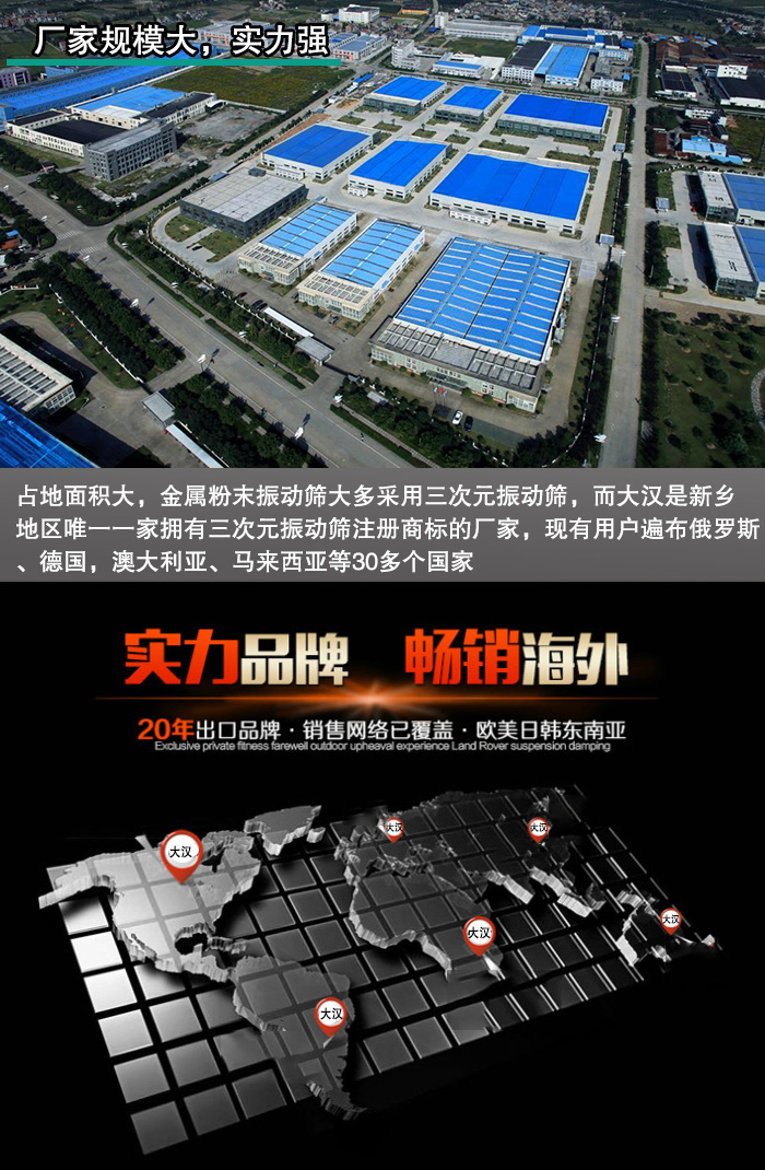 新鄉(xiāng)大漢占地10000平方米,擁有自己獨立的大型工業(yè)廠房,各種設(shè)備齊全,而且新鄉(xiāng)大漢生產(chǎn)振動篩30余年,積累了大量的生產(chǎn)經(jīng)驗。金屬粉末振動篩大多采用三次元振動篩,而大漢是新鄉(xiāng)擁有三次元振動篩注冊商標(biāo)的廠家,專業(yè)性非常強,現(xiàn)有用戶遍布俄羅斯、德國,澳大利亞、馬來西亞等30多個國家,用戶口碑好。