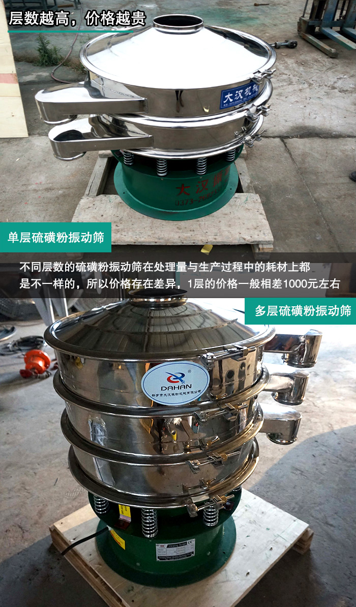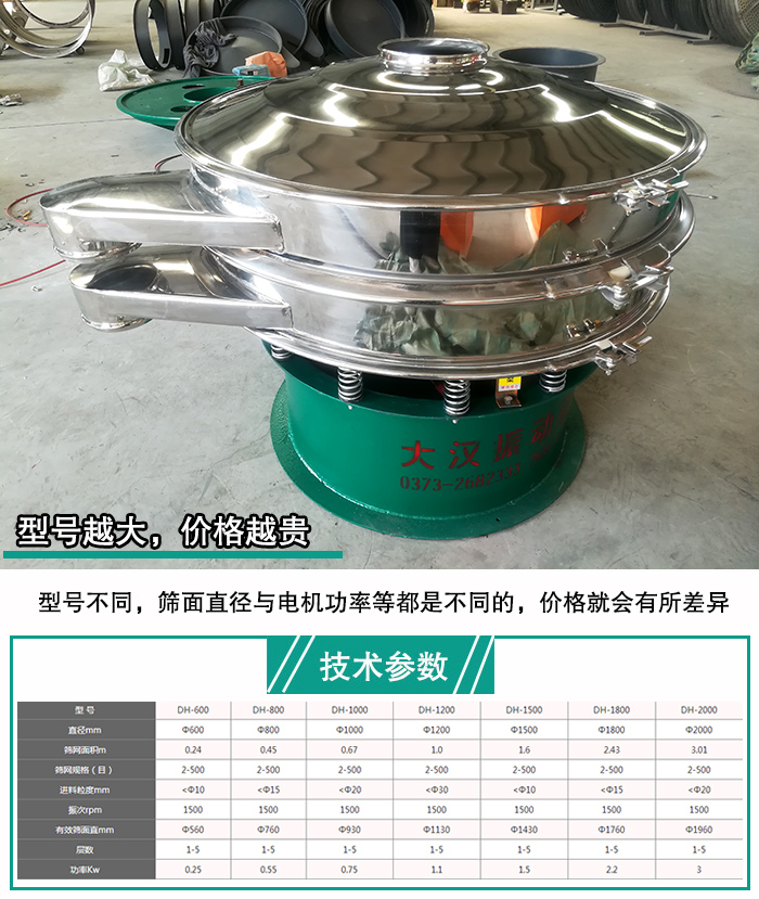 大漢硫磺粉振動篩型號有DH600、DH800、DH1000、DH1200、DH1500、DH1800、DH2000,型號不同的硫磺粉振動篩篩面直徑與電機(jī)功率等都是不同的,所以不同型號的硫磺粉振動篩機(jī)價(jià)格是不同的。