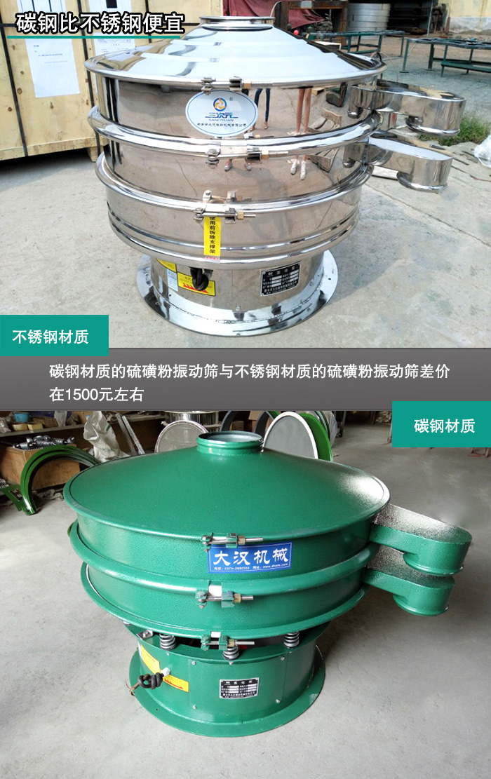 硫磺粉振動篩多少錢一臺?根據(jù)以往用戶的采購數(shù)據(jù)顯示,新鄉(xiāng)大漢一臺硫磺粉振動篩5000~12000元。造成大漢硫磺粉振動篩差價(jià)的原因主要還是由于其型號、材質(zhì)、篩面設(shè)計(jì)層數(shù)等因素決定的,接下里小編將為您帶來詳細(xì)介紹。