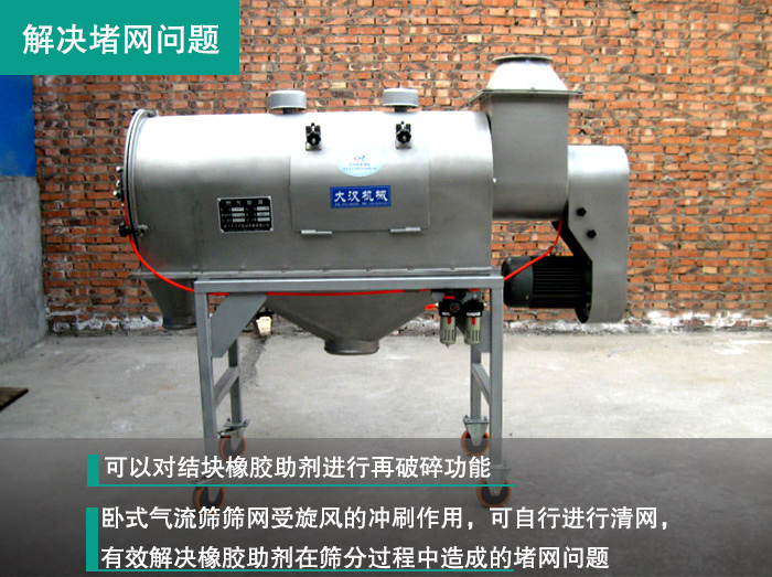 臥式氣流篩可以對結塊物料進行再破碎功能,特別適合篩分處理輕比重、粘度大、纖維多、有靜電、易團聚的超細微粉和特殊物料,而臥式氣流篩篩網(wǎng)受旋風的沖刷作用,可自行進行清網(wǎng),有效解決橡膠助劑在篩分過程中造成的堵網(wǎng)問題。