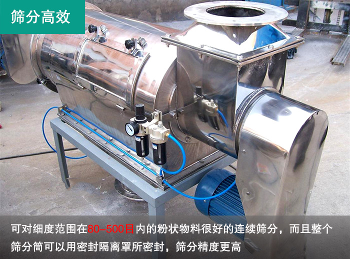 橡膠助劑本身流動性比較差,在篩分過程中容易吸附在篩網(wǎng)上,造成堵網(wǎng),產(chǎn)量要求還大,使用一般的振動篩難以滿足生產(chǎn)的要求,臥式氣流篩也叫做氣旋篩,是一種專門針對微細粉進行高精度篩分的設備,在篩分橡膠助劑時主要包含以下幾點優(yōu)勢: