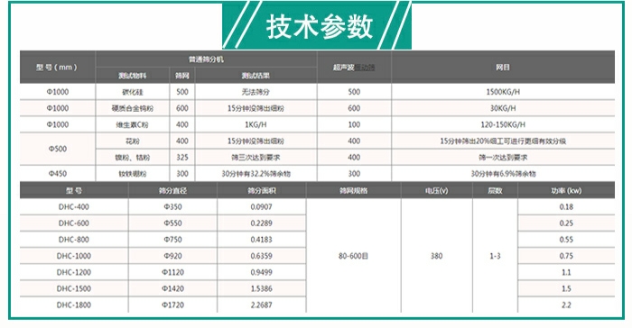 大漢石墨粉振動篩型號齊全,DHC400、DHC600、DHC800、DHC1000、DHC1200、DHC1500、DHC1800多種類型可以滿足用戶不用篩分量的需求,不同石墨粉振動篩之間,篩面直徑、電機功率是不同的,所以在篩分產(chǎn)量、篩分效率方面也是不同的,所以不同型號的石墨粉振動篩價格不一。