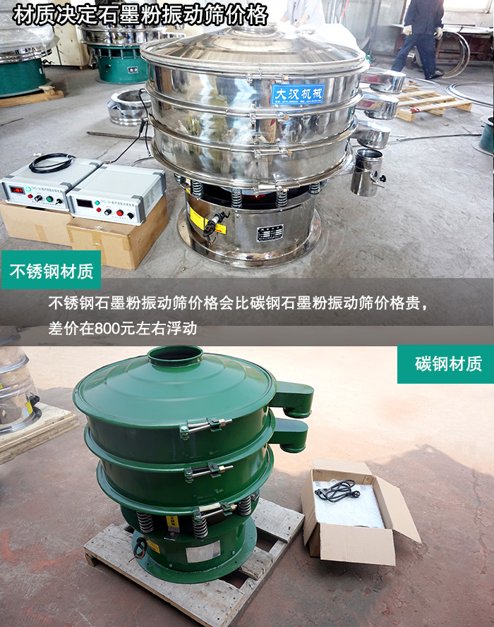 大漢石墨粉振動篩材質(zhì)分為兩種:一種是與物料接觸部分采用304不銹鋼材質(zhì),機座采用碳鋼材質(zhì),另一種是整機采用304不銹鋼材質(zhì),不銹鋼材質(zhì)與碳鋼材質(zhì)的區(qū)別就在于不銹鋼所含的合金元素的鋼材,所以不銹鋼石墨粉振動篩價格會比碳鋼石墨粉振動篩價格貴。