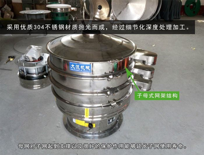 大漢生產(chǎn)的一米不銹鋼振動(dòng)篩采用優(yōu)質(zhì)304不銹鋼材質(zhì)拋光而成,經(jīng)過(guò)細(xì)節(jié)化深度處理加工,再加上其采用新式子母式網(wǎng)架結(jié)構(gòu),子網(wǎng)壓在母網(wǎng)上面,對(duì)子網(wǎng)起到支撐以及很好的保護(hù)作用,有了母網(wǎng)的保護(hù),子網(wǎng)的使用壽命提高了十幾倍,減低了用戶的維修成本。并且子網(wǎng)的換網(wǎng)工作非常方便,有效的節(jié)省了因換篩網(wǎng)而浪費(fèi)的生產(chǎn)時(shí)間。