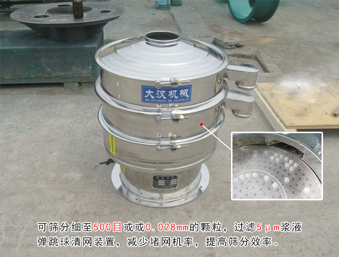 可篩分細(xì)至500目或或0.028mm的顆粒,過(guò)濾5μm漿液,大漢一米不銹鋼振動(dòng)篩在篩分精度上成就顯著,另外還專門(mén)裝配有彈跳球清網(wǎng)裝置,物料在篩分過(guò)程中彈跳球會(huì)不停的篩網(wǎng)進(jìn)行碰撞,減少物料堵網(wǎng)的現(xiàn)象,進(jìn)一步提高一米不銹鋼振動(dòng)篩的篩分精度與效率。