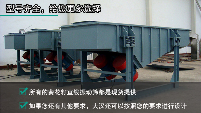 以上是關(guān)于葵花籽直線振動(dòng)篩廠家的介紹,如果時(shí)間條件允許的話,建議您好還是進(jìn)行實(shí)地考察,不要盲目購(gòu)買,大漢葵花籽直線振動(dòng)篩支持免費(fèi)試機(jī),車接車送,歡迎用戶攜料來廠考察參觀。