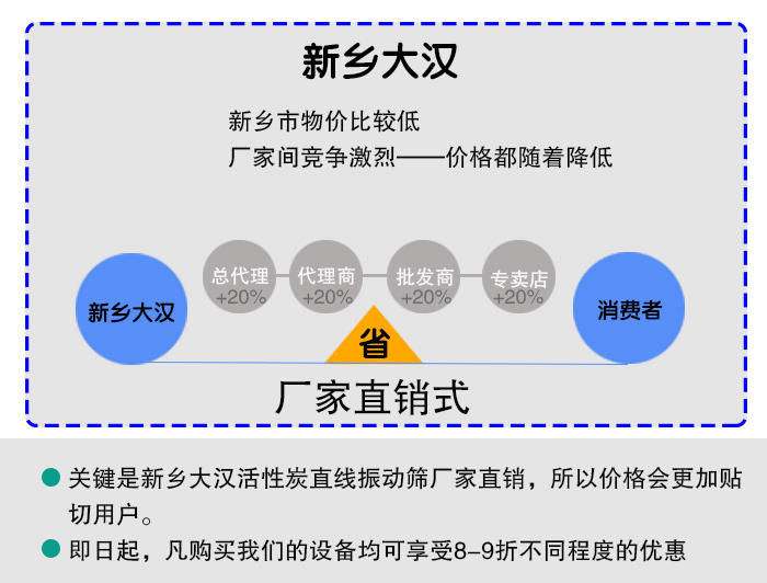 大漢廠家位于新鄉(xiāng)市,物價比較低,人均消費水平也不算高,所以活性炭直線振動篩銷售價格自然也會有所降低,活性炭直線振動篩廠家比較多,廠家間競爭激烈,導(dǎo)致河南市場上很多的廠家會以低價銷售設(shè)備,提高設(shè)備銷量,這樣整體的價格都隨著降低。再加上,新鄉(xiāng)大漢活性炭直線振動篩廠家直銷,所以價格會更加貼切用戶。而且大漢廠家為回饋新老用戶,即日起,凡購買我們的設(shè)備均可享受8-9折不同程度的優(yōu)惠。