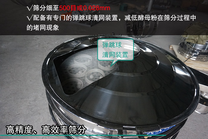 酵母粉屬于食品行業(yè)的一種調(diào)味劑,所以在篩分酵母粉時對其篩分精度要求是很嚴格的,而三次元振動篩作為一種高精度細粉篩分設(shè)備,篩分細至500目或0.028mm,另外三次元振動篩配備有專門的彈跳球清網(wǎng)裝置,減低酵母粉在篩分過程中的堵網(wǎng)現(xiàn)象,提高篩分精度和篩分效率。
