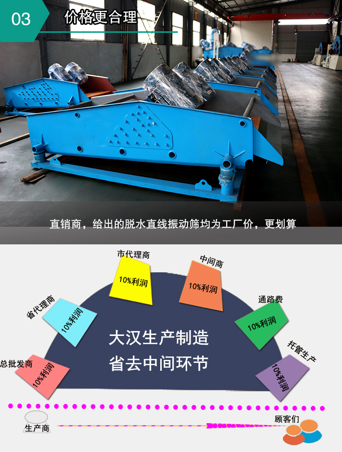 大漢公司是一家直銷商,給出的脫水直線振動(dòng)篩均為工廠價(jià),無(wú)中間商,銷售環(huán)節(jié)少,產(chǎn)生的額外費(fèi)用低,相對(duì)來(lái)說(shuō),更劃算。