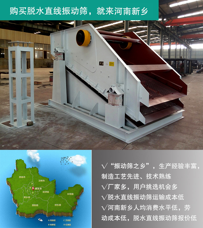 3、河南新鄉(xiāng)地理位置優(yōu)越,鐵路,公路交錯(cuò)縱橫,脫水直線振動(dòng)篩運(yùn)輸成本低,可以減少用戶的部分投資成本。