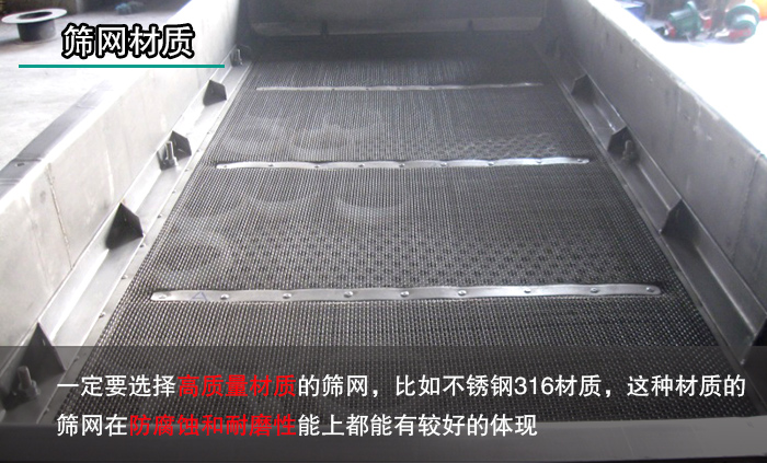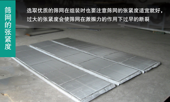 選取優(yōu)質(zhì)的篩網(wǎng)在組裝時也要注意篩網(wǎng)的張緊度適宜就好,過大的張緊度會使篩網(wǎng)在激振力的作用下過早的斷裂。