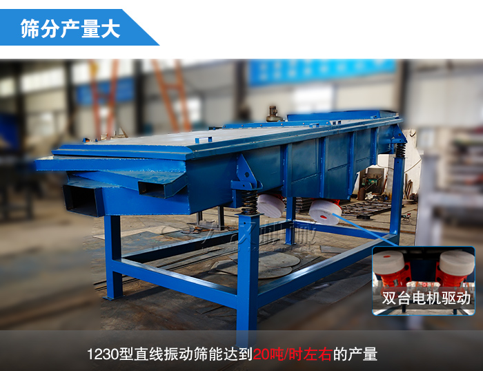 篩分產(chǎn)量是用戶造選擇設(shè)備時關(guān)注較多的一項指標,直線振動篩采用雙臺電機驅(qū)動作用,物料受激振力的作用在篩面殺昂被拋起,進而完成對棕剛玉的大小分級,篩分產(chǎn)量大,大漢廠家生產(chǎn)的直線振動篩型號齊全,每種型號的設(shè)備對應(yīng)不同的篩分產(chǎn)量,舉例來說,一臺小型號的520型直線振動篩每小時產(chǎn)量在3-5噸,而1230型直線振動篩能達到20噸/時左右的產(chǎn)量,用戶可以根據(jù)自身產(chǎn)量的要求進行選擇,大漢廠家作為大型直銷型企業(yè),生產(chǎn)的設(shè)備價格不僅便宜,還可以按照用戶產(chǎn)量要求非標定制。