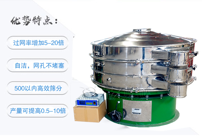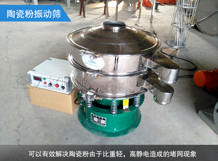 一般為超聲波的振動(dòng)篩,電源產(chǎn)生的高頻電通過換能器轉(zhuǎn)換成高頻正弦形式的縱向振蕩波,可以有效解決陶瓷粉由于比重輕,高靜電造成的堵網(wǎng)現(xiàn)象。