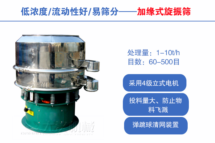 由于加緣式旋振篩采用4級立式電機,所以比較適合流動性好的涂料除雜,加緣型旋振篩是在普通旋振篩基礎上加強包邊,是投料量大、防止物料飛濺、易與觀測篩網的機型。另外,加緣式旋振篩采用彈跳球清網裝置,可降低堵網機率。