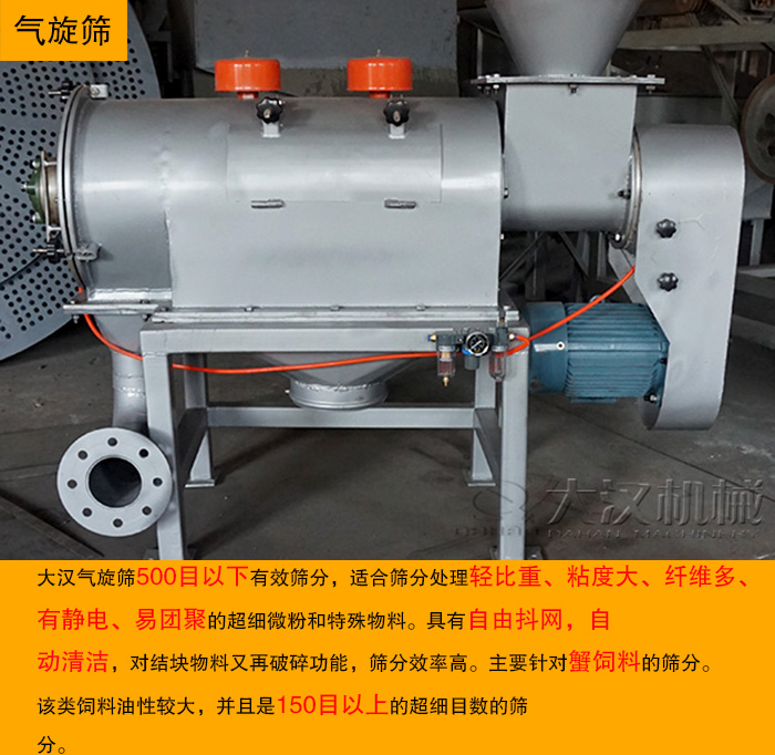 優(yōu)勢(shì):大漢氣旋篩500目以下有效篩分,特別適合篩分處理輕比重、粘度大、纖維多、有靜電、易團(tuán)聚的超細(xì)微粉和特殊物料。具有自由抖網(wǎng),自動(dòng)清潔,對(duì)結(jié)塊物料又再破碎功能,篩分效率高。