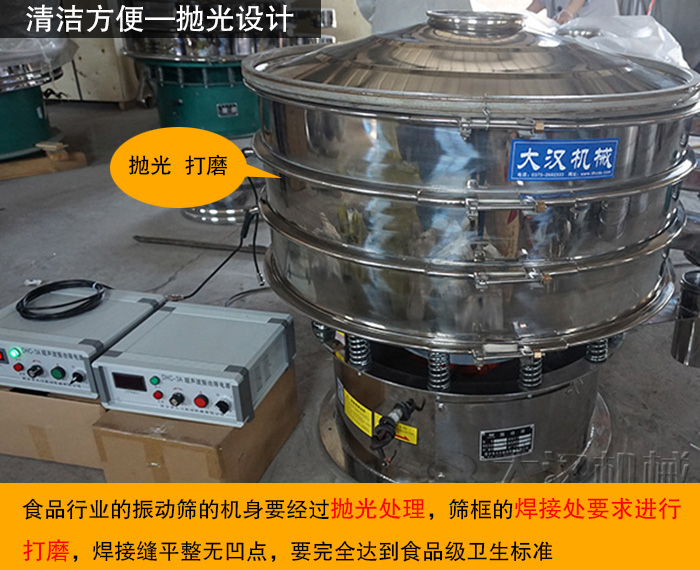 對(duì)于食品行業(yè),由于這些微細(xì)粉末的物料非常容易附著難以清理,所以食品行業(yè)的振動(dòng)篩需要具有清潔方便、無(wú)衛(wèi)生死角的特點(diǎn),這就需要食品振動(dòng)篩的機(jī)身要經(jīng)過(guò)拋光處理,決不能有倒刺出現(xiàn),因?yàn)閽伖夂蟮恼駝?dòng)篩不容易過(guò)沾染這些粉末,而且清洗更方便。篩框的焊接處要求進(jìn)行打磨,焊接縫平整無(wú)凹點(diǎn),要完全達(dá)到食品衛(wèi)生標(biāo)準(zhǔn)。