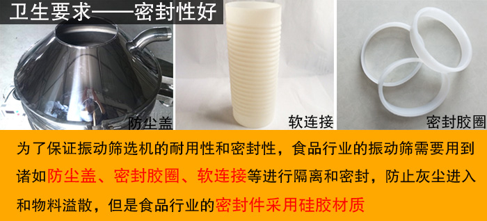 為了保證食品原材料的衛(wèi)生情況,振動(dòng)篩必須有優(yōu)良的密封性,可以避免物料在篩分過(guò)程中溢散,浪費(fèi)物料的同時(shí)還對(duì)工作環(huán)境造成污染,影響生產(chǎn)進(jìn)程。為了保證振動(dòng)篩選機(jī)的耐用性和密封性,食品行業(yè)的振動(dòng)篩需要用到諸如防塵蓋、密封膠圈、軟連接等進(jìn)行隔離和密封,防止灰塵進(jìn)入和物料溢散,但是食品行業(yè)的密封件采用硅膠材質(zhì),雖然硅膠材質(zhì)在價(jià)格方面高于橡膠材質(zhì),但是其耐用性、穩(wěn)定性、衛(wèi)生程度是橡膠材質(zhì)遠(yuǎn)遠(yuǎn)比不上的。