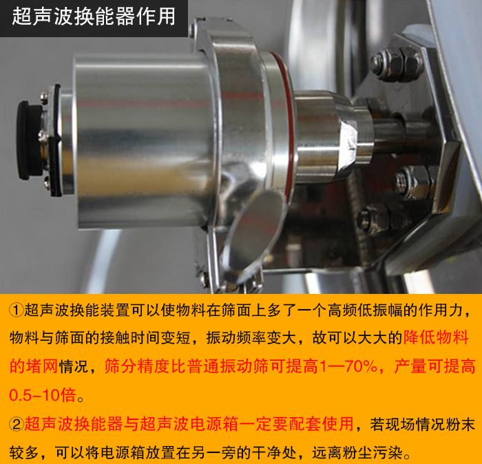 超聲波換能器是一種能量轉(zhuǎn)換器件,是超聲波振動篩的核心裝置,超聲波換能器由中央壓電陶瓷元件,前后金屬蓋板,預(yù)應(yīng)力螺桿,電極片以及絕緣管組成。超聲波振動篩上的超聲波換能裝置可以使物料在篩面上多了一個高頻低振幅的作用力,物料與篩面的接觸時間變短,振動頻率變大,故可以大大的降低物料的堵網(wǎng)情況,篩分精度比普通振動篩可提高1—70%,產(chǎn)量可提高0.5-10倍。超聲波換能器與超聲波電源箱一定要配套使用,若現(xiàn)場情況粉末較多,可以將電源箱放置在另一旁的干凈處,遠離粉塵污染。