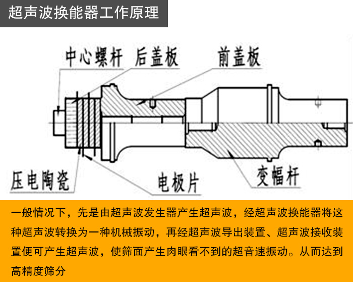 超聲波振動篩之所以能夠解決強吸附性、易團聚、高靜電、高精細、高密度、輕比重等篩分難題,關(guān)鍵在于超聲波換個器這一核心配件采得以實現(xiàn)高精度高效率篩分作業(yè)。那么超聲波換能器到底是什么呢?它又有什么作用呢?