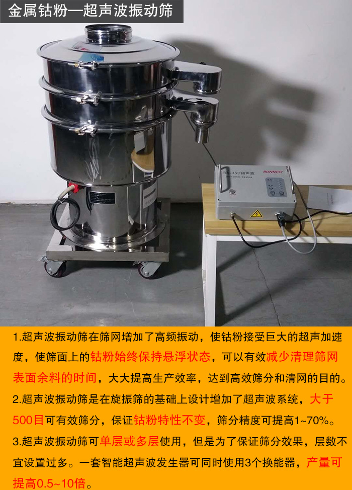 √高精度:在旋振篩的基礎(chǔ)上設(shè)計(jì)增加了超聲波系統(tǒng),能夠高效的解決輕比重、高密度、強(qiáng)吸附性、易團(tuán)聚、高靜電及高精度物料的篩分難題,大于500目可有效篩分,保證鈷粉特性不變,篩分精度可提高1~70%。