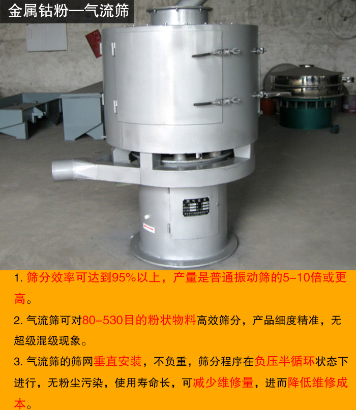 氣流篩篩網(wǎng)為圓筒狀,置于機(jī)體內(nèi),作業(yè)時鈷粉不是直接投放到篩體內(nèi),而是經(jīng)由一截螺旋輸送機(jī)送入,篩箱內(nèi)的分流葉片高速連續(xù)轉(zhuǎn)動,將送入的鈷粉吹起沖向圓筒狀的篩網(wǎng),細(xì)料透過篩網(wǎng)進(jìn)入成品儲料室,粗料從出料口流出。