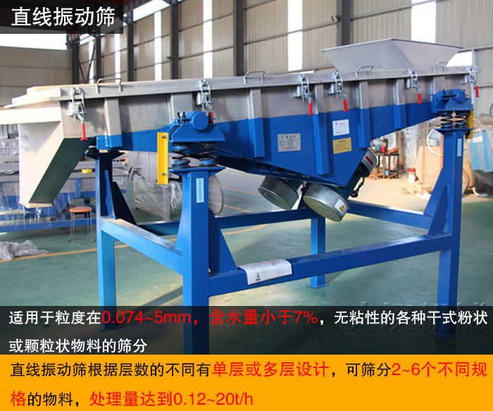 直線振動(dòng)篩利用兩臺(tái)振動(dòng)電機(jī)反向旋轉(zhuǎn),使激振器產(chǎn)生反向激振力,并帶動(dòng)篩箱做前后直線運(yùn)動(dòng),當(dāng)物料從一端的進(jìn)料口進(jìn)入篩箱,均勻分布在篩面上,在激振力和物料自重的合力作用下,物料在篩面上被拋起,向出料口跳躍式前進(jìn),后通過各層孔徑大小不一的篩網(wǎng)實(shí)現(xiàn)對(duì)物料的篩分、分級(jí),物料由每層對(duì)應(yīng)的出料口排出,從而完成整個(gè)篩分過程,適用于粒度在0.074~5mm,含水量小于7%,無粘性的各種干式粉狀或顆粒狀物料的篩分,大給料粒度不大于10mm,處理量達(dá)到0.12~20t/h,不同型號(hào)的直線振動(dòng)篩產(chǎn)量是不同的,用戶需根據(jù)實(shí)際產(chǎn)量需求進(jìn)行合理選擇。