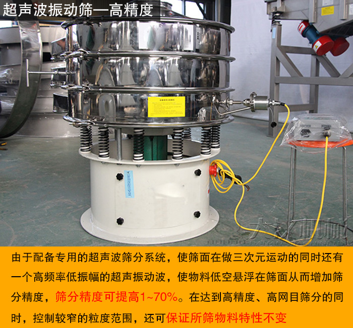 由于配備專用的超聲波篩分系統(tǒng),使篩面在做三次元運動的同時還有一個高頻率低振幅的超聲振動波,使物料低空懸浮在篩面從而增加篩分精度,篩分精度可提高1~70%。在達到高精度、高網(wǎng)目篩分的同時,控制較窄的粒度范圍,還可保證所篩物料特性不變,滿足胡椒粉這種食用調味品的篩分要求。