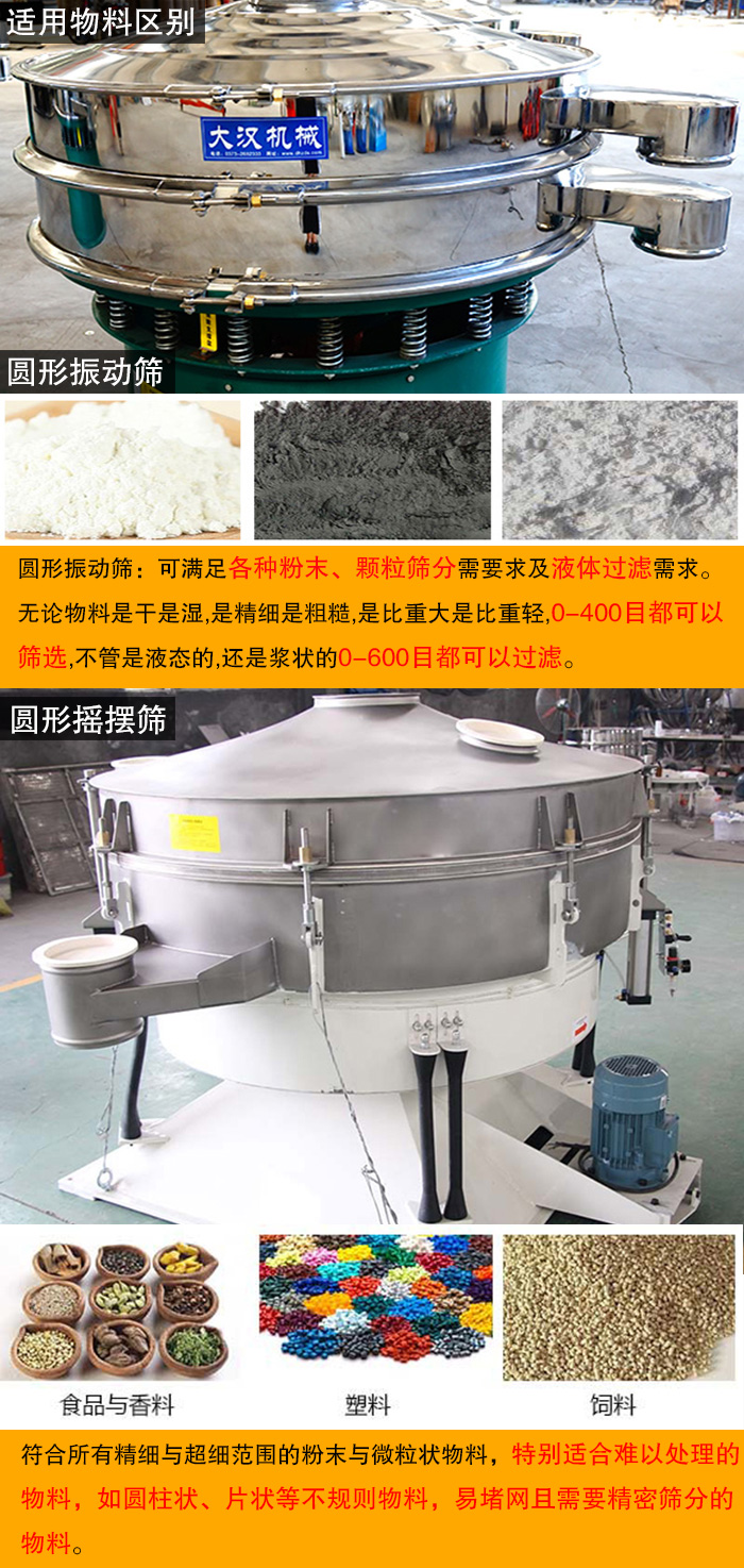 圓形振動篩(旋振篩)與圓形搖擺篩都是小型的精細篩分設(shè)備,同時從外觀上都是圓形的,篩分五阿貍哦也大多屬于粉末狀,令許多用戶在選購時對這兩者之間的區(qū)別認識較為模糊,以至于無法選擇適合自己的篩分設(shè)備,大漢小編將為大家介紹圓形振動篩與圓形搖擺篩的不同之處,并總結(jié)如下: