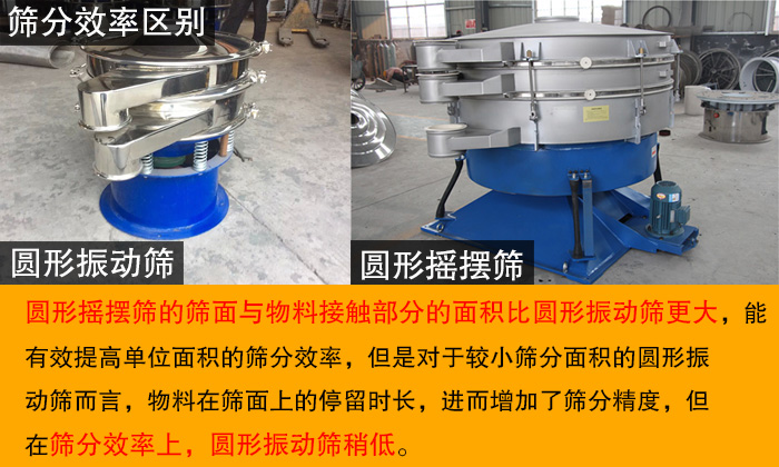 圓形搖擺篩的篩面與物料接觸部分的面積比圓形振動篩更大,能有效提高單位面積的篩分效率,但是對于較小篩分面積的圓形振動篩而言,物料在篩面上的停留時長,進而增加了篩分精度,但在篩分效率上,圓形振動篩稍低。