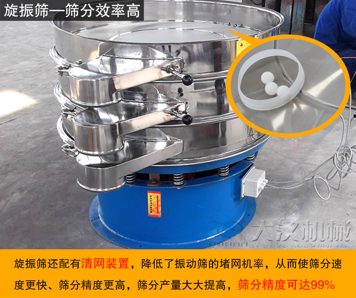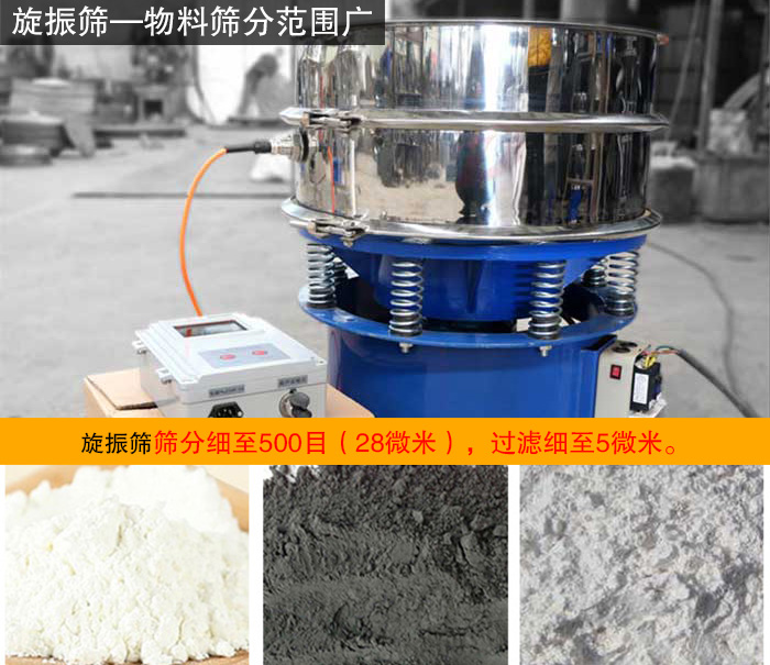 旋振篩可以篩分過濾顆粒,細(xì)粉,漿液的物料,既可粗略分級,又可精細(xì)篩分或者過濾,篩分效率高,根據(jù)實際生產(chǎn)需要可單層或多層使用,全封閉結(jié)構(gòu),無粉塵溢散,篩網(wǎng)不阻塞、粉末不飛揚(yáng)、篩分細(xì)至500目(28微米),過濾細(xì)至5微米。可對氧化鋅粉末高效篩分。