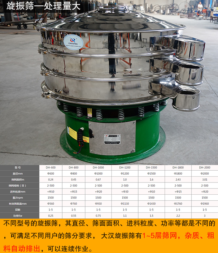 旋振篩型號從DH-600、DH-800、DH-1000、DH-1200、DH-1500、DH-1800、DH-2000,不同型號的旋振篩,其直徑、篩面面積、進(jìn)料粒度、功率等都是不同的,可滿足不同用戶的篩分要求, 大漢旋振篩有1~5層篩網(wǎng),雜質(zhì)、粗料自動排出,可以連續(xù)作業(yè)。