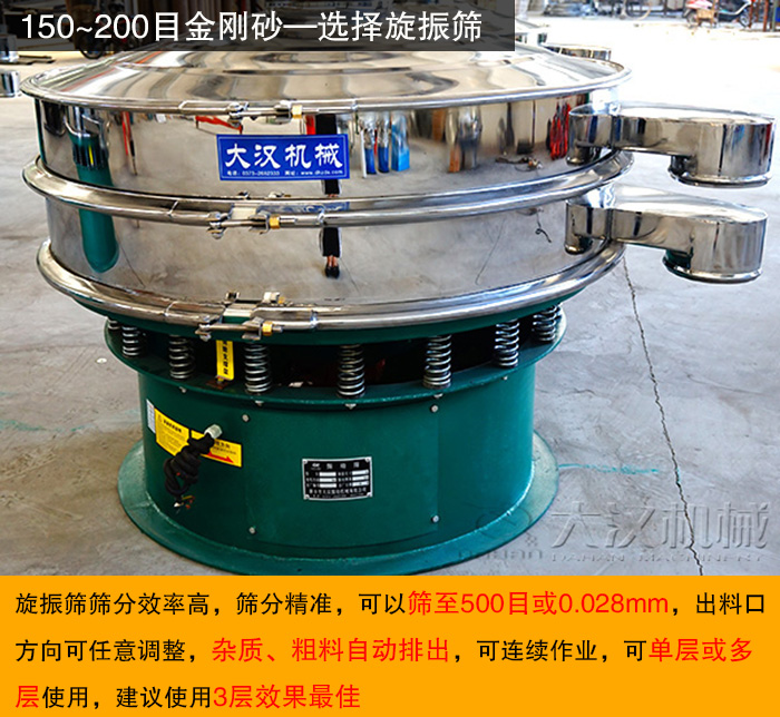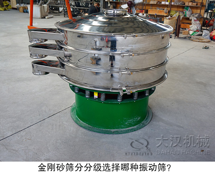 不同目數(shù)的金剛砂,選擇的振動篩是不同的,金剛砂粗目(8~10目),中目(150~200目),細(xì)目(300目以上)三大類,針對不同目數(shù)的振動篩,大漢廠家推薦以下3種類型的振動篩。